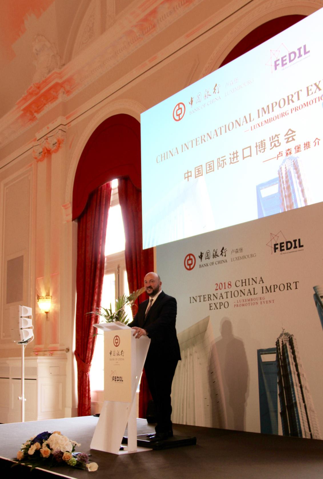黄长庆大使在致辞表示,举办中国国际进口博览会是中国国家主席习近平做出的重大决策。进口博览会是世界上第一个以进口为主题的国家级博览会,这在国际贸易发展史上是一大创举,是中国政府坚持对外开放基本国策、推动新一轮高水平对外开放的政策宣示,也是“一带一路”国际合作倡议的具体体现。中国是全球第二大经济体、第二大进口国和消费国,当前中国经济已由高速增长阶段转向高质量发展阶段,对优质、特色商品和服务的需求更加旺盛。习近平主席在博鳌亚洲论坛上的主旨演讲中指出,经济全球化是不可逆转的时代潮流,中国坚持对外开放的基本国策,坚持打开国门搞建设。中国开放的大门不会关闭,只会越开越大。未来五年,中国将进口超过10万亿美元的商品和服务。卢森堡经济高度外向,是世界主要金融中心、航空物流中心和高科技创新研发国家。期待卢森堡企业积极行动起来,参加首届中国进口博览会。也期待施耐德副首相如期前往上海参观进口博览会。